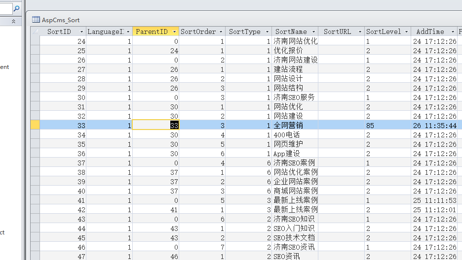 在aspcms_sort中查看到一个SortID 33,对应的值ParentID也是33这个形成的循环导致,修改就可以可以了。